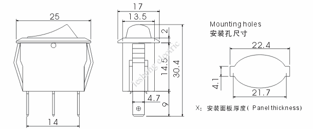 工作參數(shù) Contact Rating: 250VAC,6A 接觸電阻 Contact Resistance: 35mΩ MAX 絕緣電阻 Insulation Resistance: 500VDC,50MΩ 耐壓強度 Dielectric Strength: 1250VAC,1MIN 工作溫度 Operating Temperature: T100 電器壽命 Electrical Life: 10000 Cycles |